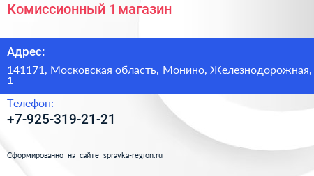 Комиссионный №1, магазин по адресу 141171, Московская область, Монино, Железнодорожная, 1 в дальнейшем Организация, размещена в следующих категориях: