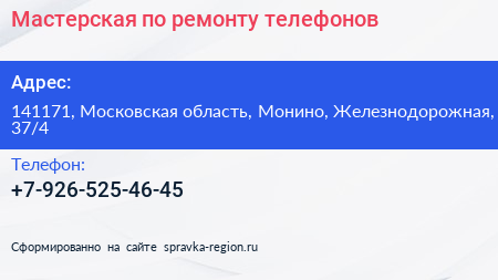 Мастерская по ремонту телефонов по адресу 141171, Московская область, Монино, Железнодорожная, 37/4 в дальнейшем Организация, размещена в следующих категориях: