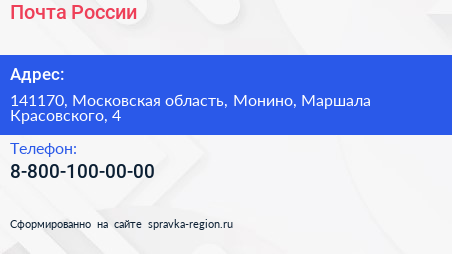 Почта России по адресу 141170, Московская область, Монино, Маршала Красовского, 4 в дальнейшем Организация, размещена в следующих категориях: