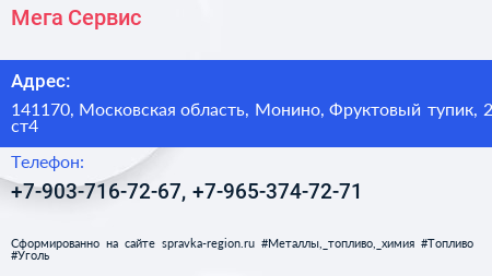 Мега Сервис по адресу 141170, Московская область, Монино, Фруктовый тупик, 2 ст4 в дальнейшем Организация, размещена в следующих категориях: