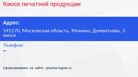 Киоск печатной продукции по адресу 141170, Московская область, Монино, Дементьева, 3 киоск в дальнейшем Организация, размещена в следующих категориях: