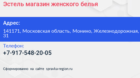 Эстель, магазин женского белья по адресу 141171, Московская область, Монино, Железнодорожная, 31 в дальнейшем Организация, размещена в следующих категориях: