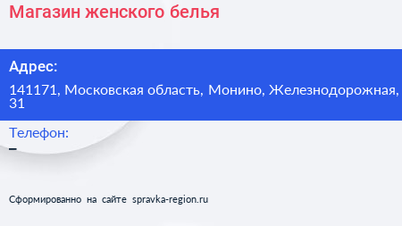 Магазин женского белья по адресу 141171, Московская область, Монино, Железнодорожная, 31 в дальнейшем Организация, размещена в следующих категориях: