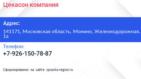 Цекасон, компания по адресу 141171, Московская область, Монино, Железнодорожная, 1а в дальнейшем Организация, размещена в следующих категориях: