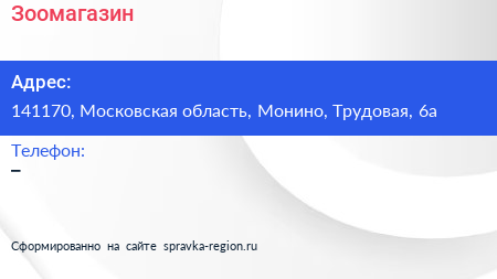 Зоомагазин по адресу 141170, Московская область, Монино, Трудовая, 6а в дальнейшем Организация, размещена в следующих категориях: