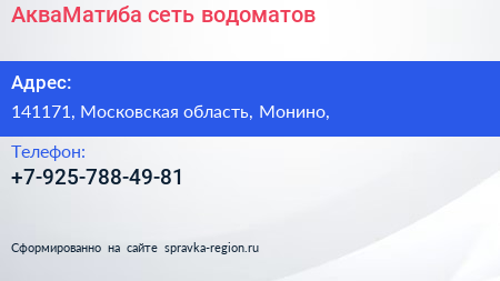 АкваМатиба, сеть водоматов по адресу 141171, Московская область, Монино, в дальнейшем Организация, размещена в следующих категориях: