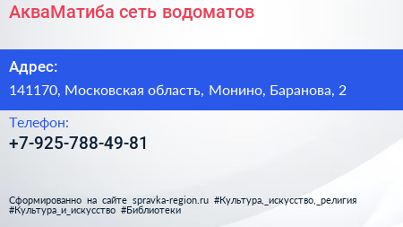 АкваМатиба, сеть водоматов по адресу 141170, Московская область, Монино, Баранова, 2 в дальнейшем Организация, размещена в следующих категориях: