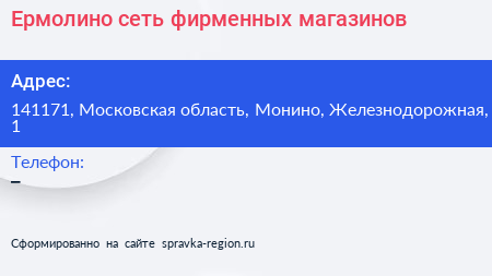 Ермолино, сеть фирменных магазинов по адресу 141171, Московская область, Монино, Железнодорожная, 1 в дальнейшем Организация, размещена в следующих категориях: