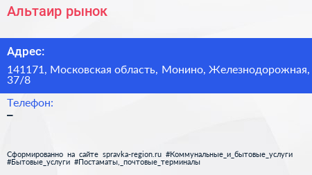 Альтаир, рынок по адресу 141171, Московская область, Монино, Железнодорожная, 37/8 в дальнейшем Организация, размещена в следующих категориях: