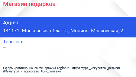 Магазин подарков по адресу 141171, Московская область, Монино, Московская, 2 в дальнейшем Организация, размещена в следующих категориях:
