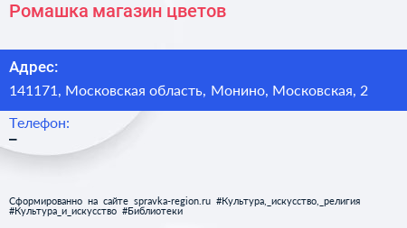 Ромашка, магазин цветов по адресу 141171, Московская область, Монино, Московская, 2 в дальнейшем Организация, размещена в следующих категориях: