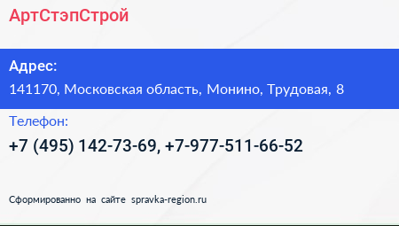 АртСтэпСтрой по адресу 141170, Московская область, Монино, Трудовая, 8 в дальнейшем Организация, размещена в следующих категориях: