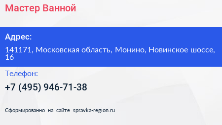 Мастер Ванной по адресу 141171, Московская область, Монино, Новинское шоссе, 16 в дальнейшем Организация, размещена в следующих категориях: