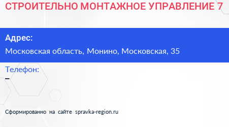 СТРОИТЕЛЬНО-МОНТАЖНОЕ УПРАВЛЕНИЕ №7 по адресу Московская область, Монино, Московская, 35 в дальнейшем Организация, размещена в следующих категориях: