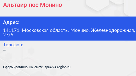 Альтаир, пос. Монино по адресу 141171, Московская область, Монино, Железнодорожная, 27/5 в дальнейшем Организация, размещена в следующих категориях: