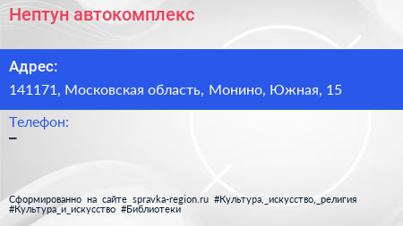 Нептун, автокомплекс по адресу 141171, Московская область, Монино, Южная, 15 в дальнейшем Организация, размещена в следующих категориях: