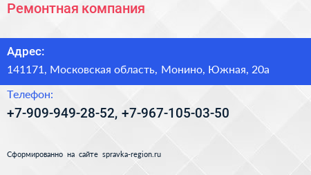 Ремонтная компания по адресу 141171, Московская область, Монино, Южная, 20а в дальнейшем Организация, размещена в следующих категориях: