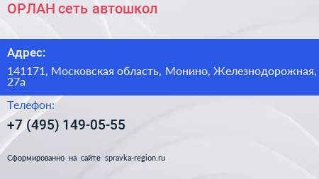 ОРЛАН, сеть автошкол по адресу 141171, Московская область, Монино, Железнодорожная, 27а в дальнейшем Организация, размещена в следующих категориях: