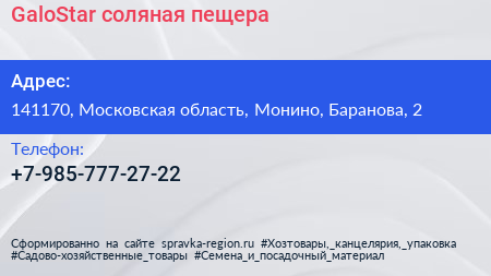 GaloStar, соляная пещера по адресу 141170, Московская область, Монино, Баранова, 2 в дальнейшем Организация, размещена в следующих категориях: