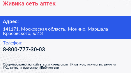 Живика, сеть аптек по адресу 141171, Московская область, Монино, Маршала Красовского, вл13 в дальнейшем Организация, размещена в следующих категориях: