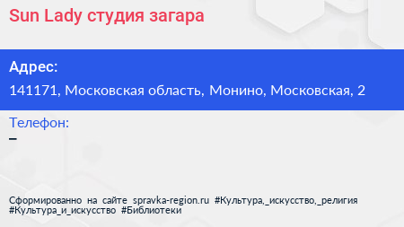 Sun Lady, студия загара по адресу 141171, Московская область, Монино, Московская, 2 в дальнейшем Организация, размещена в следующих категориях: