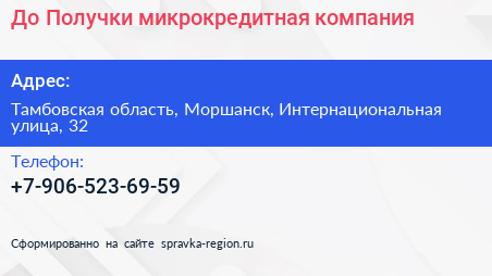 До Получки, микрокредитная компания по адресу Тамбовская область, Моршанск, Интернациональная улица, 32 в дальнейшем Организация, размещена в следующих категориях: