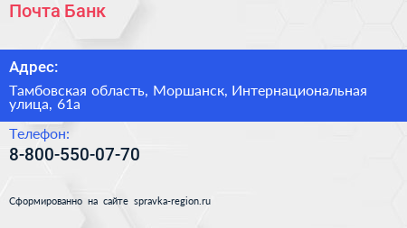 Почта Банк по адресу Тамбовская область, Моршанск, Интернациональная улица, 61а в дальнейшем Организация, размещена в следующих категориях: