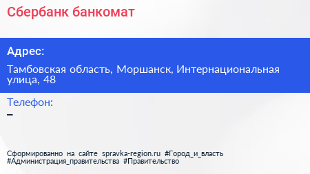 Сбербанк, банкомат по адресу Тамбовская область, Моршанск, Интернациональная улица, 48 в дальнейшем Организация, размещена в следующих категориях:
