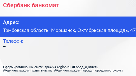 Сбербанк, банкомат по адресу Тамбовская область, Моршанск, Октябрьская площадь, 47 в дальнейшем Организация, размещена в следующих категориях:
