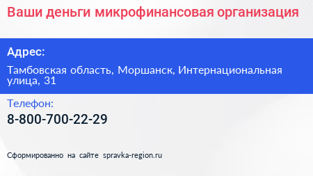 Ваши деньги, микрофинансовая организация по адресу Тамбовская область, Моршанск, Интернациональная улица, 31 в дальнейшем Организация, размещена в следующих категориях: