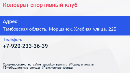 Коловрат, спортивный клуб по адресу Тамбовская область, Моршанск, Хлебная улица, 22Б в дальнейшем Организация, размещена в следующих категориях: