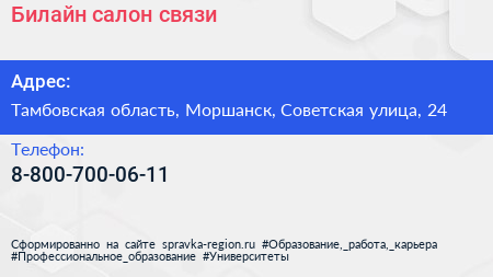 Билайн, салон связи по адресу Тамбовская область, Моршанск, Советская улица, 24 в дальнейшем Организация, размещена в следующих категориях:
