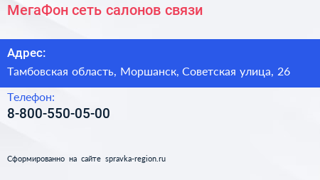 МегаФон, сеть салонов связи по адресу Тамбовская область, Моршанск, Советская улица, 26 в дальнейшем Организация, размещена в следующих категориях: