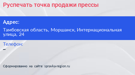 Руспечать, точка продажи прессы по адресу Тамбовская область, Моршанск, Интернациональная улица, 24 в дальнейшем Организация, размещена в следующих категориях: