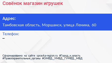 Совёнок, магазин игрушек по адресу Тамбовская область, Моршанск, улица Ленина, 60 в дальнейшем Организация, размещена в следующих категориях: