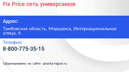 Fix Price, сеть универсамов по адресу Тамбовская область, Моршанск, Интернациональная улица, 6 в дальнейшем Организация, размещена в следующих категориях: