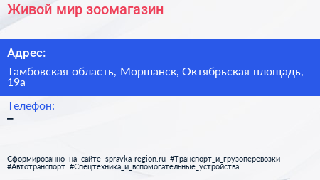 Живой мир, зоомагазин по адресу Тамбовская область, Моршанск, Октябрьская площадь, 19а в дальнейшем Организация, размещена в следующих категориях: