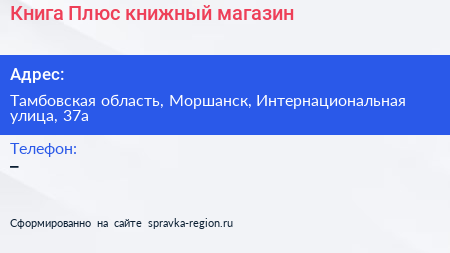 Книга Плюс, книжный магазин по адресу Тамбовская область, Моршанск, Интернациональная улица, 37а в дальнейшем Организация, размещена в следующих категориях: