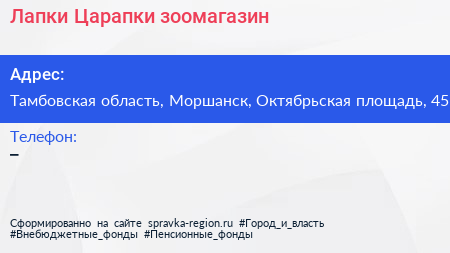Лапки-Царапки, зоомагазин по адресу Тамбовская область, Моршанск, Октябрьская площадь, 45 в дальнейшем Организация, размещена в следующих категориях: