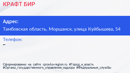 КРАФТ БИР по адресу Тамбовская область, Моршанск, улица Куйбышева, 54 в дальнейшем Организация, размещена в следующих категориях:
