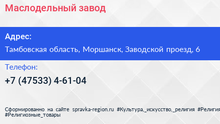 Маслодельный завод по адресу Тамбовская область, Моршанск, Заводской проезд, 6 в дальнейшем Организация, размещена в следующих категориях: