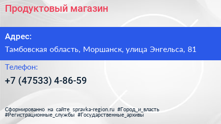 Продуктовый магазин по адресу Тамбовская область, Моршанск, улица Энгельса, 81 в дальнейшем Организация, размещена в следующих категориях: