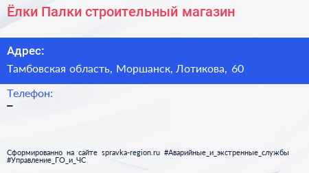 Ёлки-Палки, строительный магазин по адресу Тамбовская область, Моршанск, Лотикова, 60 в дальнейшем Организация, размещена в следующих категориях:
