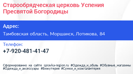 Старообрядческая церковь Успения Пресвятой Богородицы по адресу Тамбовская область, Моршанск, Лотикова, 84 в дальнейшем Организация, размещена в следующих категориях: