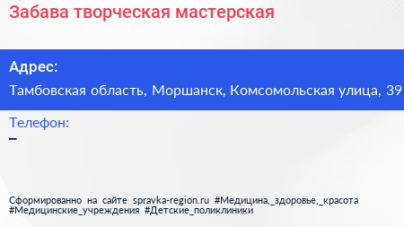 Забава, творческая мастерская по адресу Тамбовская область, Моршанск, Комсомольская улица, 39 в дальнейшем Организация, размещена в следующих категориях: