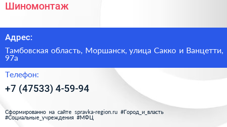 Шиномонтаж по адресу Тамбовская область, Моршанск, улица Сакко и Ванцетти, 97а в дальнейшем Организация, размещена в следующих категориях: