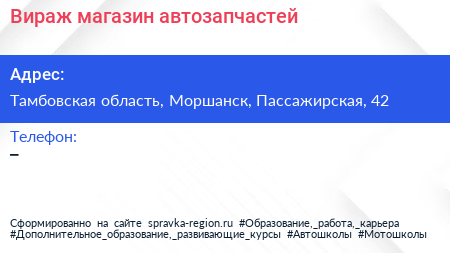 Вираж, магазин автозапчастей по адресу Тамбовская область, Моршанск, Пассажирская, 42 в дальнейшем Организация, размещена в следующих категориях: