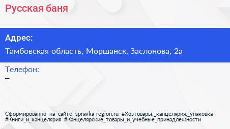 Русская баня по адресу Тамбовская область, Моршанск, Заслонова, 2а в дальнейшем Организация, размещена в следующих категориях: