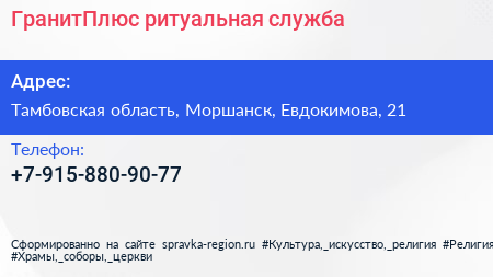 ГранитПлюс, ритуальная служба по адресу Тамбовская область, Моршанск, Евдокимова, 21 в дальнейшем Организация, размещена в следующих категориях: