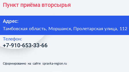 Пункт приёма вторсырья по адресу Тамбовская область, Моршанск, Пролетарская улица, 112 в дальнейшем Организация, размещена в следующих категориях: